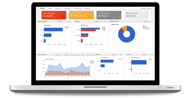 Visualiza la información más actual de tus ventas por sucursal, cortes de caja, formas de pago, valuación de inventario por sucursal, entradas, salidas y requisiciones realizadas y la forma en como fueron atendidas.